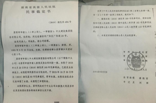 “2019年12月9日,湖南省高级人民法院(以下简称:湖南高院)下达了【(2019)湘民再686号】民事裁决书,让我们被缠诉了六年的诉讼终于划上了句号。然而,衡山县人民法院(以下简称:衡山法院)个别法官以避免国家赔偿发生为由,一面请求衡阳市中级人民法院(以下简称:衡阳中院)出面协调收集材料,一面帮已经被判刑的当事人的女儿出谋划策继续跟我公司缠诉。我们公司作为一家军转建筑企业,难免有这样那样的官司,如果都遇上这样的法官,我们的企业还如何生存?”中太建设集团有限公司(以下简称:中太公司)负责人向我们抱怨。