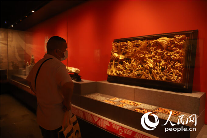 观众观看汕头金漆木雕《百万雄师过大江》。人民网 马晓楠摄
