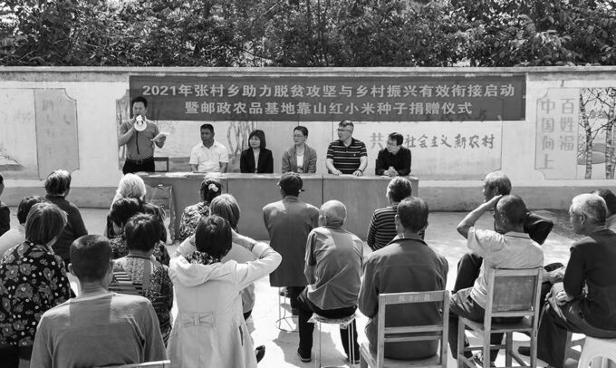新乡市邮政分公司向辉县市张村乡枣园村捐赠小米种子仪式现场。