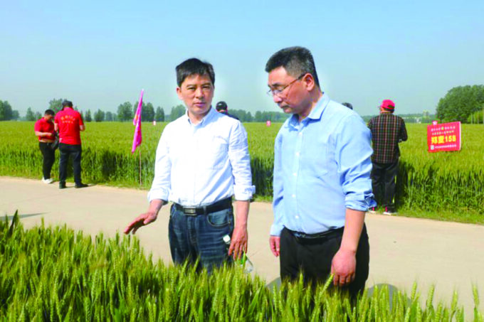 河南省农科院小麦研究所所长雷振生(右)在查看郑麦158田间长势。