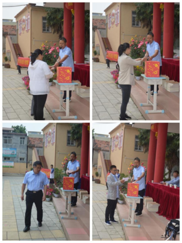 会议进行第一项:爱心捐助活动。李雯老师通报了近期东校区九年级学生李晓艳不幸患上急性髓系白血病的遭遇。得知消息后,学校迅速发起爱心捐款倡议,全校师生积极响应。会上,付校长代表学校教职工,各班班主任代表各班级学生捐款。共筹款一万六千七百零四元。会后,学校派代表及时将善款送至患者家中。
