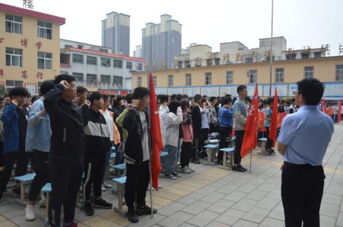 会议进行第三项:九年级中考倒计时50天誓师活动。九二班王大鑫同学宣读中考50天冲刺倡议书。随后,八一班李颖同学带领全校学生宣誓。