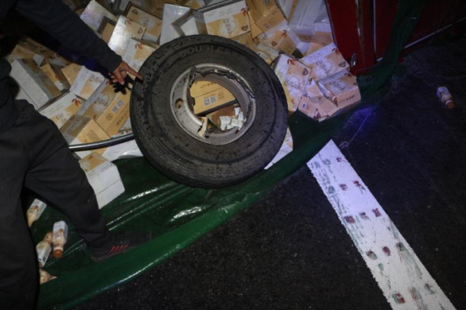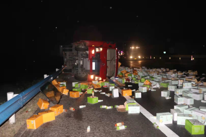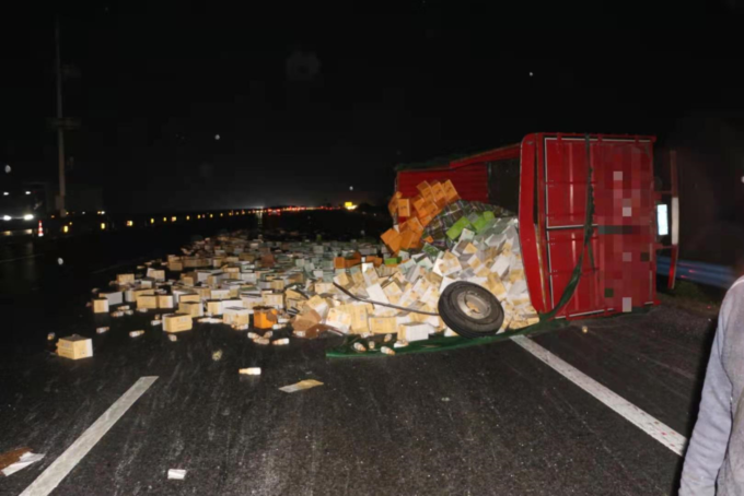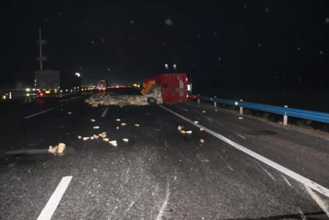 5月18日23时许,一辆蓝牌货车行驶到京港澳高速711公里西半幅时突然发生侧翻,运载的货物散落一地,占据了高速公路的第三、第四和应急车道。所幸事故发生时同方向车辆避让及时,没有发生二次事故,当事司机只是受了点皮外伤。