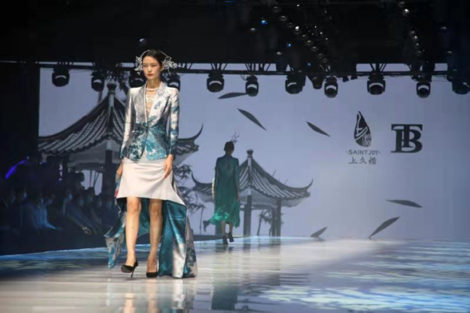 之后,一段古韵典雅的舞蹈,揭开了本届时装周的开幕大秀。踏着摩登的节拍,身着上久楷宋锦的模特缓缓走出,复古中带着优雅。
