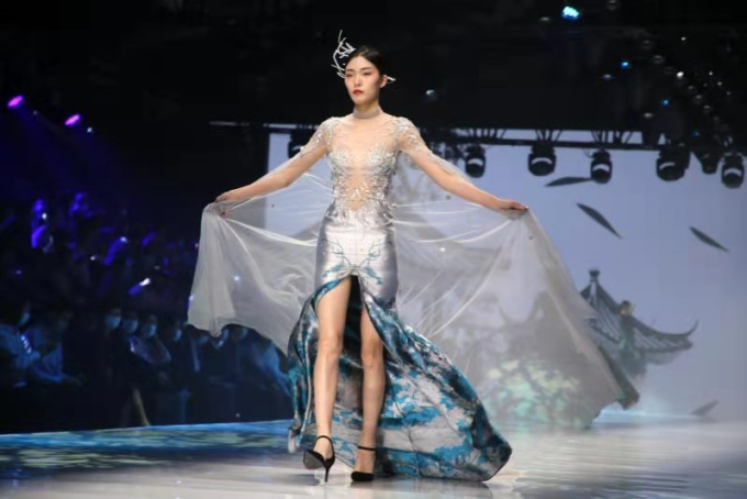上久楷是非物质文化遗产宋锦标准的第一起草单位,首开中国宋锦产业化运作之先河。他们将国家级非物质文化遗产——宋锦与中国古典名画相结合,生动演绎非遗和时尚的力量碰撞和融合,展现博大精深的丝绸传统魅力和现代艺术。充满中国古韵及时尚元素的宋锦服装设计,着实惊艳了现场观众,正好契合了本届时装周的主题“大河新声,非遗新相”。上久楷专场秀结束之后,郑州工商学院带来作品发布。