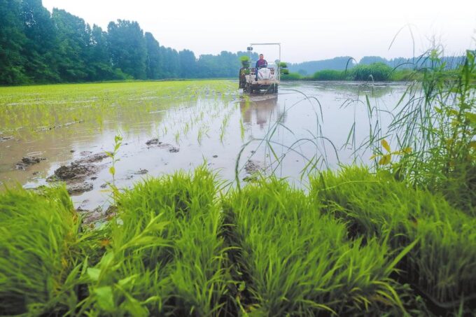5月26日,光山县罗陈乡张楼村青龙河合作社社员正在用插秧机移栽水稻秧苗。