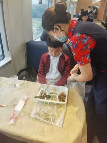 列车员瞿恺雯给阿强送来了乘务餐、饼干和酸奶等小食品