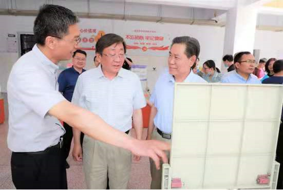 省科协副主席房卫平(左二),三门峡市市政协副主席、市科协主席马仰峡(左三)在活动现场参观科普展品