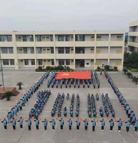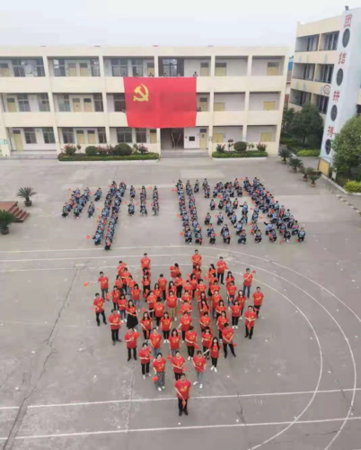 从空中俯瞰,巨大的党旗映入眼帘,汝州市临汝镇第一初级中学的学生和老师们共同组成了“1921-2021”、“100”、“中国”、“红心”等图案,代表党的百年奋斗历程以及汝州市临汝镇第一初级中学全体师生忠心爱党爱国的决心和永跟党走的坚定信念。