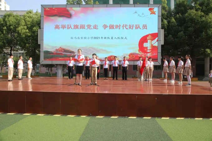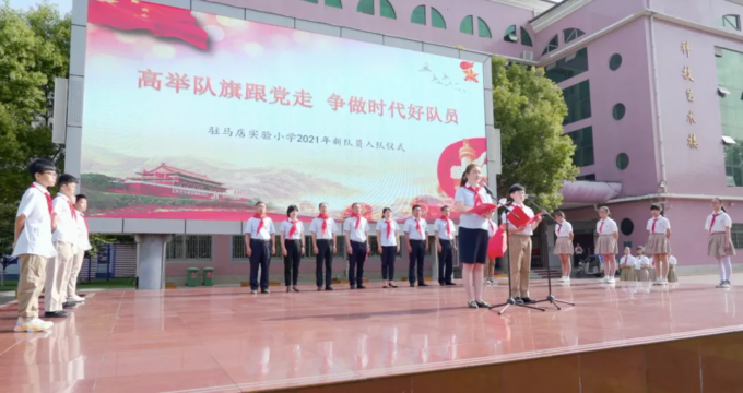 火红的队旗高高飘扬,鲜红的红领巾系满理想。为庆祝中国共产党成立100周年,继承和弘扬少先队光荣传统,培养少先队员爱党、爱国的情怀。5月28日,在六一国际儿童节来临之际,驻马店实验小学三个校区举行了“高举队旗跟党走 争做新时代好少年”少先队新队员入队仪式,735名新队员和六年级师生代表参加了仪式。
