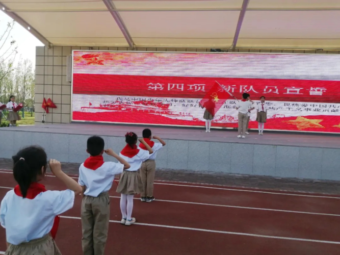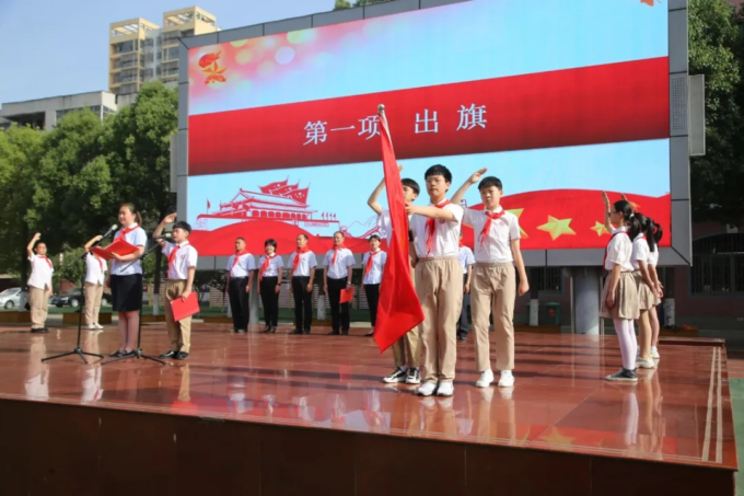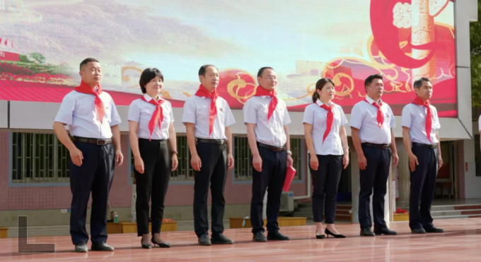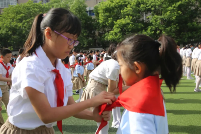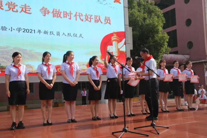 仪式上宣读了组建新中队和新队员入队决定,并为新组建的中队授旗,老队员为新队员佩戴红领巾,735名新队员光荣地加入了少先队,成为新一批共产主义接班人。