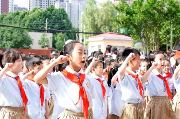 在大队长崔宏宇的带领下,少先队员们举起右拳,在队旗下庄严宣誓:“我是中国少年先锋队队员。我在队旗下宣誓:我热爱中国共产党,热爱祖国……”一字一句铿锵有力,充分显示了作为社会主义事业接班人的信心和决心。