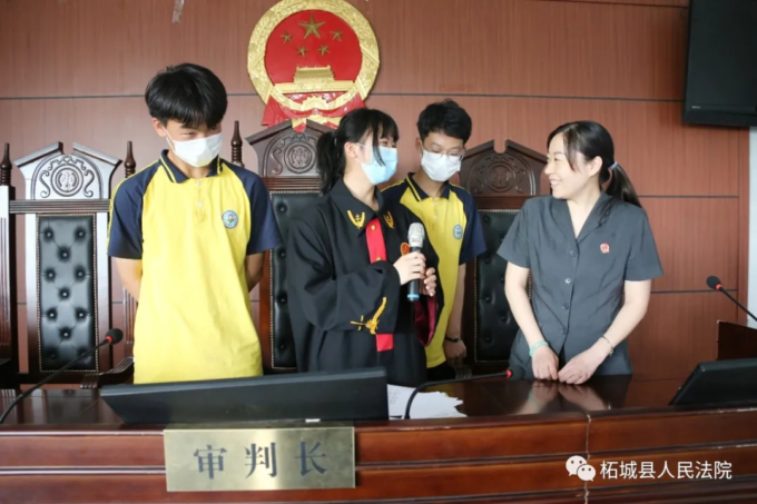 随后学生们又旁听了一起民事案件的庭审活动。庭审结束后,法官还邀请同学们走上审判台,扮演法官、书记员、原告、被告等角色,亲身体验案件庭审过程。
