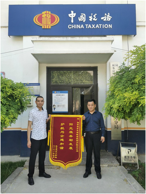 5月27日,在睢县税务局城郊税务分局门口,来自睢县建业上和院的财务总监袁伟杰将一面写着“阳光服务助发展 护航为企建和谐”的锦旗,送到了该分局负责人卜玉玺手中。