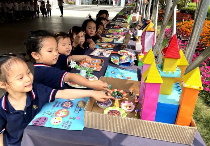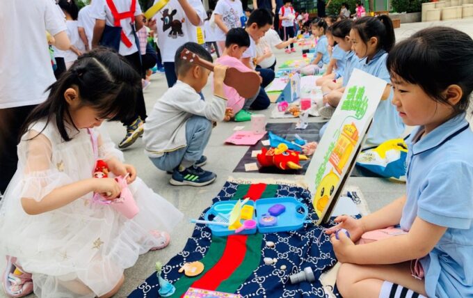 “这个小火车多少钱?”“五块钱。”、“能不能便宜一点,两块钱好不好?”“可以啊”。此起彼伏的叫卖声、讨价还价声俨然把幼儿园的户外场地成为了一个真正的贸易市场,一年一度的“小小集市”活动是孩子们最期盼的实景游戏,既能将家中的闲置玩具找到合适的小主人,也能在人来人往的交际中提高社会交往、口语表达、数学思维等多种能力,感受“买”与“卖”的乐趣。