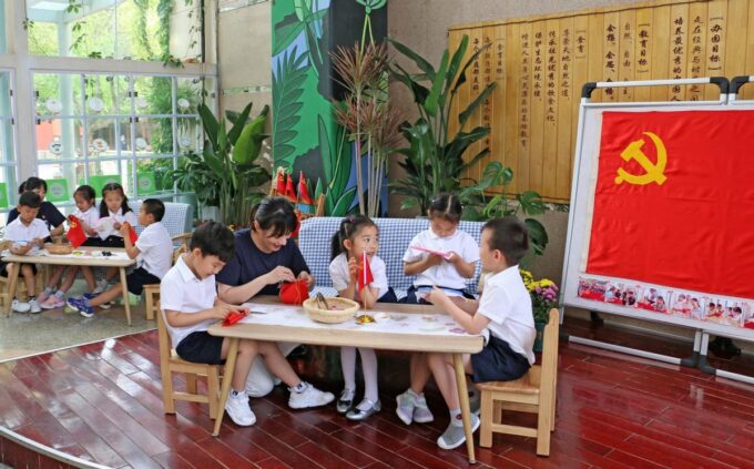 一把锤头,一把镰刀见证了中国共产党百年奋斗史,带来了中国人民的幸福生活,带来了孩子们的快乐童年。在教师的引导下用灵动的手指绣出红艳艳的党旗,一针一线传递出对中国共产党的赞美之情、感恩之心。