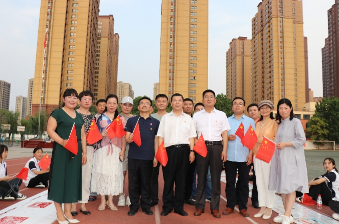 6月2日下午,商丘市四高在南操场展出根据100个辉煌历史场景创作出的100幅美术作品长卷和100幅剪纸作品长卷,庆祝中国共产党建党100周年。校党委书记李晨、校长苗军、副校长邵红卫、党办主任乔正吉等参加庆祝活动。