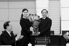 郑州大学学生代表向王复明(右)送上鲜花。(资料图片)