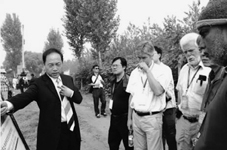 王复明(左一)向外国专家介绍研究成果。(资料图片)
