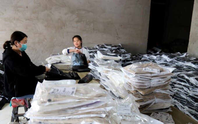 浅陌服饰有限公司的产品包装车间内,女工们正在进行女裤包装。