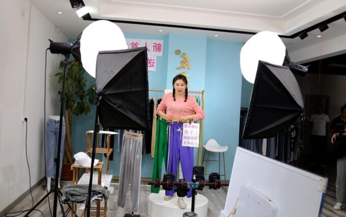 小小的直播室内设计简洁,但智能手机、三脚架、补光灯、电脑等各类设备一应俱全,主播正从身后货架拿过自主设计的一件衣服热情洋溢地介绍着,一位工作人员在一旁负责后台监控与互动。从设备、灯光到主播讲解、工作人员之间的配合,很难想象这只是一个县域的服饰公司。