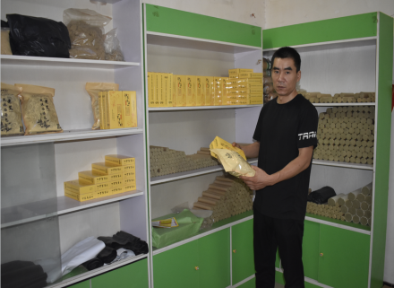 见到刘天才时,他刚从镇上发完货回来。“端午节快到了,艾草加工产品又到了热销季。每天一大早我都会安排人把昨晚按通讯地址码好的艾草加工产品装上车,然后驱车赶到镇上的物流网点,把客户网购的产品发往全国各地。平均每天在拼多多上接收的购货单子有100多单,成交额在2000元以上,印象禹王山艾灸条、足浴包等系列艾加工产品在网上销路不错”,刘天才高兴地对记者说。