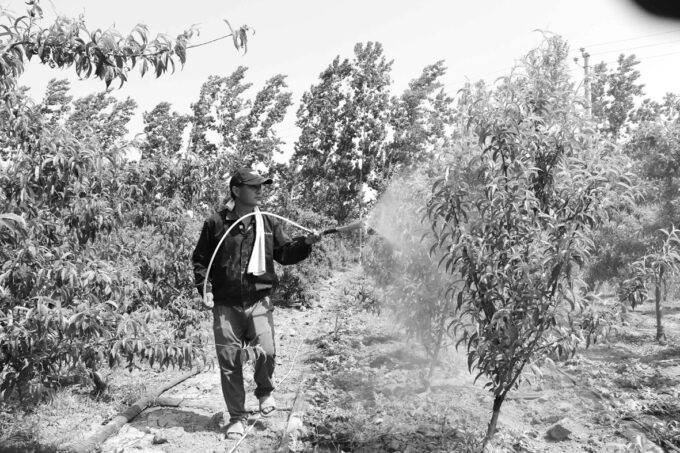 鹿邑县王皮溜镇张寨村村民王继田发展优质桃40余亩,有10多个品种,并能错峰供应市场,取得了良好经济效益。图为6月11日,一名社员在王继田的桃园里喷施药剂。