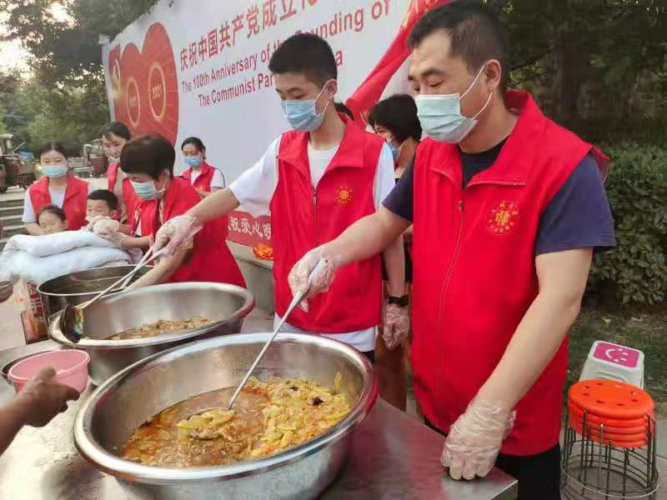 据了解,爱心晚餐于2017年6月26日开餐,志愿者达420人,运营经费全部由爱心人士、爱心团体捐赠,服务对象以环卫工人为主,以及孤寡老人、流浪人员等社会弱势群体。每天两菜一汤,鸡蛋、馒头和包子随便吃。四年来就餐达7万多人次,平均每天就餐60多人次,最多时就餐人数达107多人。当前,爱心晚餐已经成为爱心虞城的一张名片,一餐影响一座城,一餐温暖一城人。一曲《没有共产党就没有新中国》循环播放着,现场每个志愿者在不停的忙碌着……
