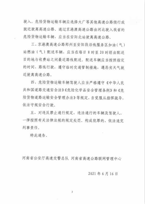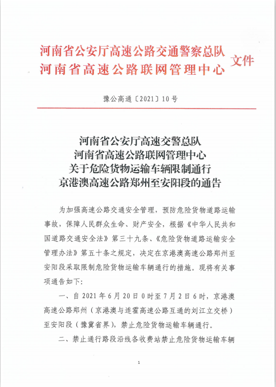 一、自2021年6月20日0时至7月2日6时,京港澳高速公路郑州(京港澳与连霍高速公路互通的刘江立交桥)至安阳段(豫冀省界),禁止危险货物运输车辆通行。