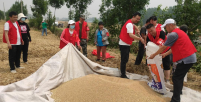 柏城街道机关干部志愿者在田间帮助群众将收获后的小麦装袋