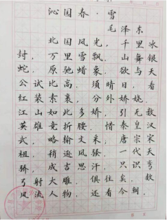 比赛前,三个考场中心校负责人首先宣布比赛规则:教师自带笔墨,比赛时间为一个小时(9:30——10:30)。先软笔后硬笔,软笔作品上交后随即发硬笔比赛用纸。比赛要求:1、统一纸张,盖有灈阳镇中心校公章的专用纸。2、单人单桌,教师不准带字帖和手机。3、软笔书法内容:从爱国守法、爱岗敬业、关爱学生、终生学习中选出12个字,每个字写一遍。4、硬笔书法内容:毛泽东的《沁园春.雪》。(标点符号占一格)