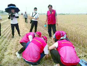 郑玲(左一)与商丘市科协、夏邑县科协的工作人员到家庭农场指导工作。