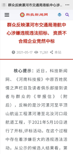 5月17日,标题为《群众反映漯河市交通局港航中心涉嫌违规违法招标、 资质不合规企业竞然中标》的报道刊载于《河南科技报》主办的科技新闻网、中国农业科技110网。