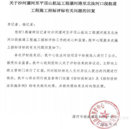 直到6月8日仍未得到公开回应。记者再次联系了漯河市交通运输局副局长赵峰(分管招标业主港航建设与养护中心、工程监督科)并提交了给书面材料,其答复会尽快给出合法合规的书面回复。同时向漯河市纪检委驻漯河交通局监察室主任杨建伟通报并提交了其涉嫌招标违法违规问题书面材料,截止本次追踪报道发稿仍未得到相关回应。