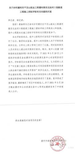 《关于沙河漯河至平顶山航运工程漯河港至北汝河口段航道工程施工招标评标有关问题的回复》