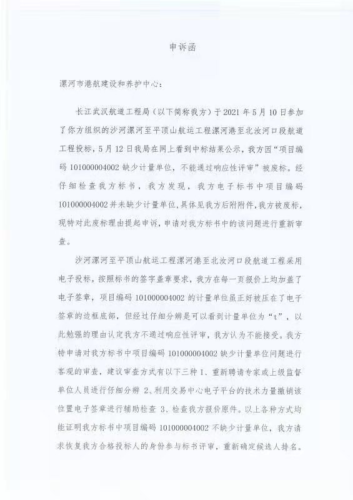 长江武汉航道工程局(以下简称我方)于2021年5月10日参加了你方组织的沙河漯河至平顶山航运工程漯河港至北汝河口段航道工程投标,5月12日我局在网上看到中标结果公示,我方因“项目编码10000000缺少计量单位,不能通过响应性评审”被废标。经仔细检查我方标书,我方发现,我方电子标书中项目编码1000004002并未缺少计量单位,具体见我方后附附件,我方被废标,现特对此废标理由提起申诉,申请对我方标书中的该问题进行重新审查。