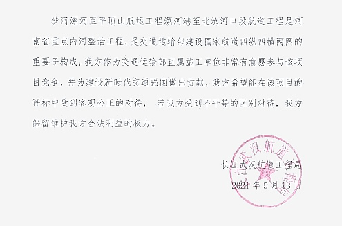 沙河漯河至平顶山航运工程漯河港至北汝河口段航道工程是河南省重点内河整治工程,是交通运输部建设国家航道四纵四横两网的重要子构成,我方作为交通运输部直属施工单位非常有意愿参与该项目竞争,并为建设新时代交通强国做出贡献,我方希望能在该项目的评标中受到客观公正的对待,若我方受到不平等的区别对待,我方保留维护我方合法利益的权力。