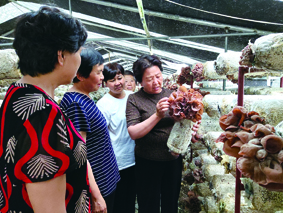 6月15日,在宝丰县张八桥镇姚店铺村的食用菌产业园内,工人正在该村支部书记徐桂玲(右一)的指导下采摘毛背木耳。该村食用菌产业园现有毛背木耳30万棒,这项新品种的引进不仅实现与香菇“错峰种植”,还带动周边60余名妇女就业,其中参与务工的农户就有18人。