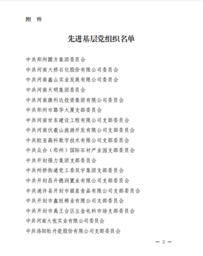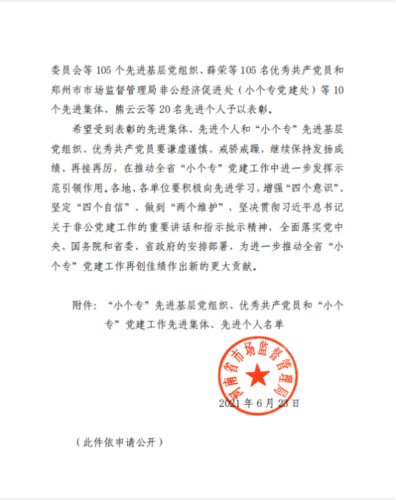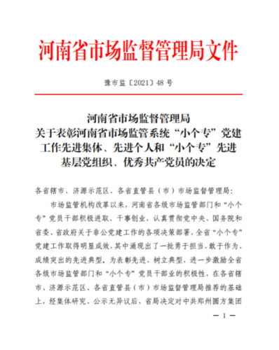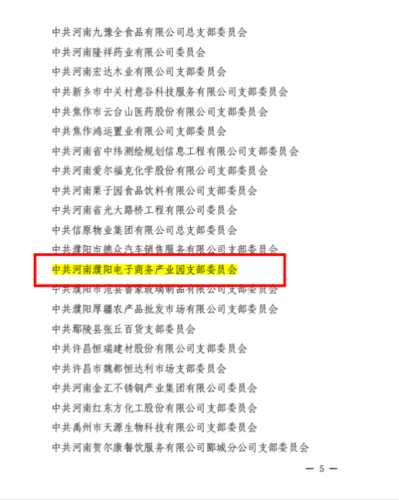 2021年6月23日,河南省市场监督管理局印发《关于表彰河南省市场监管系统“小个专”党建工作先进集体、先进个人和“小个专”先进基层党组织、优秀共产党员的决定》(豫市监〔2021〕48号),河南濮阳电子商务产业园党支部获评省级“先进基层党组织”荣誉称号。