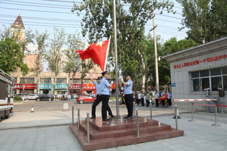 上午7时30分,升旗仪式正式开始,伴随中华人民共和国国歌,鲜艳的五星红旗在国歌声中冉冉升起。全体党员干警精神饱满、整齐队列,仰望国旗行注目礼,气氛庄严而神圣。