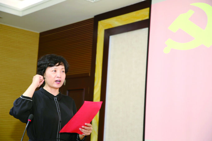 “我志愿加入中国共产党,拥护党的纲领,遵守党的章程,履行党员义务,执行党的决定,严守党的纪律,保守党的秘密,对党忠诚,积极工作,为共产主义奋斗终身,随时准备为党和人民牺牲一切,永不叛党。”党课开讲前,全体人员起立,面对党旗,举起右手,握拳过肩,谈朗玉领誓,重温入党誓词。顿时,铿锵有力的声音响彻大厅。
