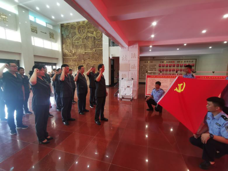 “我志愿加入中国共产党……随时准备为党和人民牺牲一切,永不叛党!”党组书记、院长王宏伟带领带领党员干警面对党旗,举起右手,庄严宣誓。一字一句铿锵有力的入党誓词回荡在法院上空。