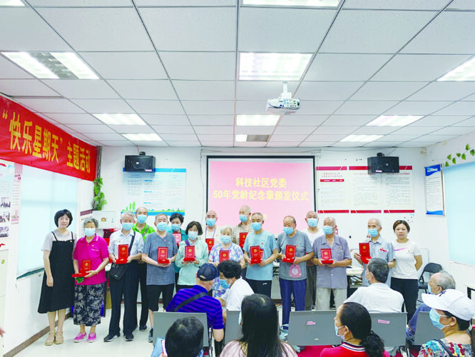 该社区党委为“光荣在党50年”的老党员颁发纪念章。