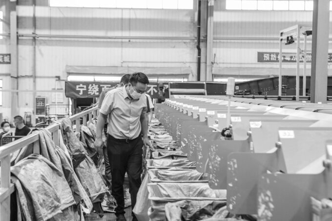 江文军在集包自动分拣线上察看安全措施落实情况。