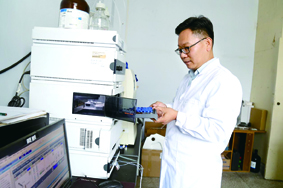 河南省化学学会会员赵俊宏正在做实验。