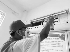 志愿者为村民清洗家用空调器。