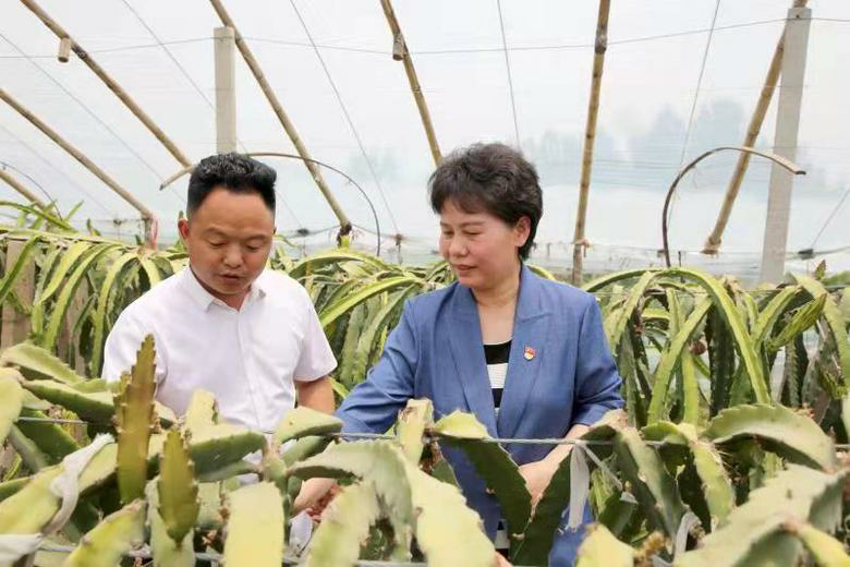 商丘市科协主席郑玲(右1)在给王飞交谈家庭农场科学种植技术。