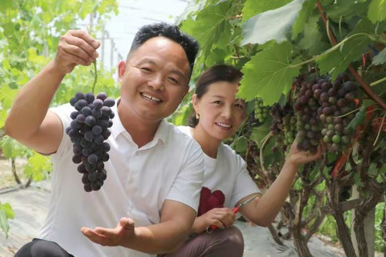 颇有收获的王飞夫妻两个乐哈哈地把采摘的葡萄给记者展示。