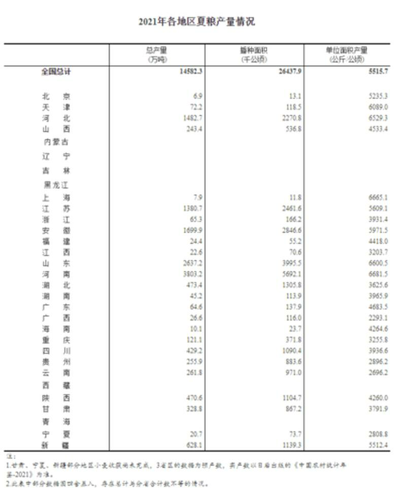 根据对全国25个夏粮生产省(区、市)的调查,2021年全国夏粮播种面积、单位面积产量、总产量如下: