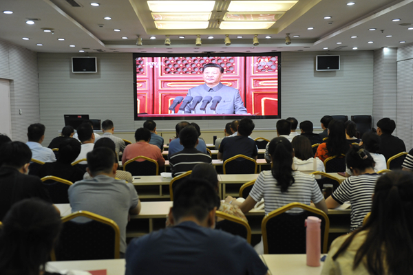 “任何想把中国共产党同中国人民分割开来、对立起来的企图,都是绝不会得逞的!9500多万中国共产党人不答应!14亿多中国人民也不答应!”“中国人民也绝不允许任何外来势力欺负、压迫、奴役我们,谁妄想这样干,必将在14亿多中国人民用血肉筑成的钢铁长城面前碰得头破血流!”习近平总书记的话慷慨激昂、句句铿锵,在会场观看直播的全体人员热血沸腾,倍感振奋。